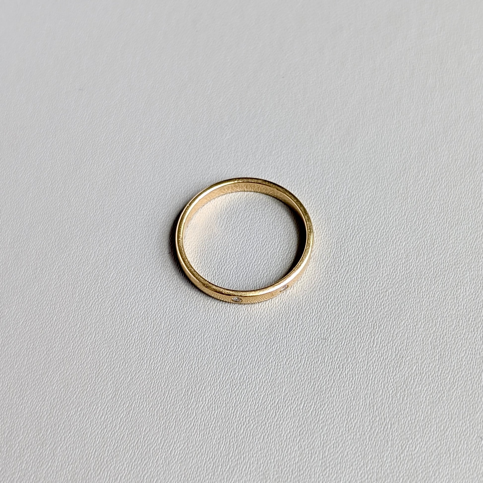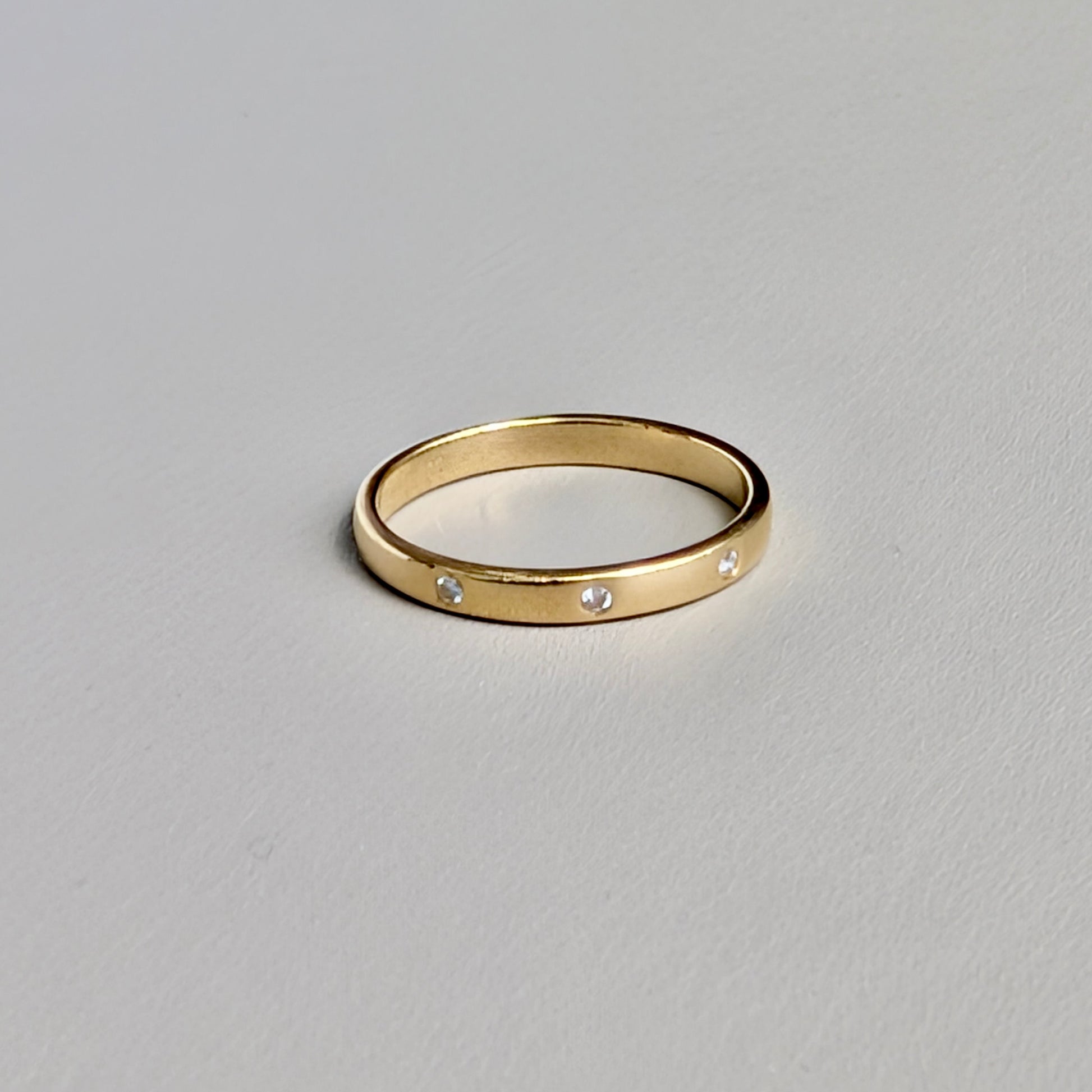A unisex 18ct yellow gold ring flush-set with 3 small natural diamonds. The ring band measuring 3mm wide and each diamond measuring approximately 1mm.