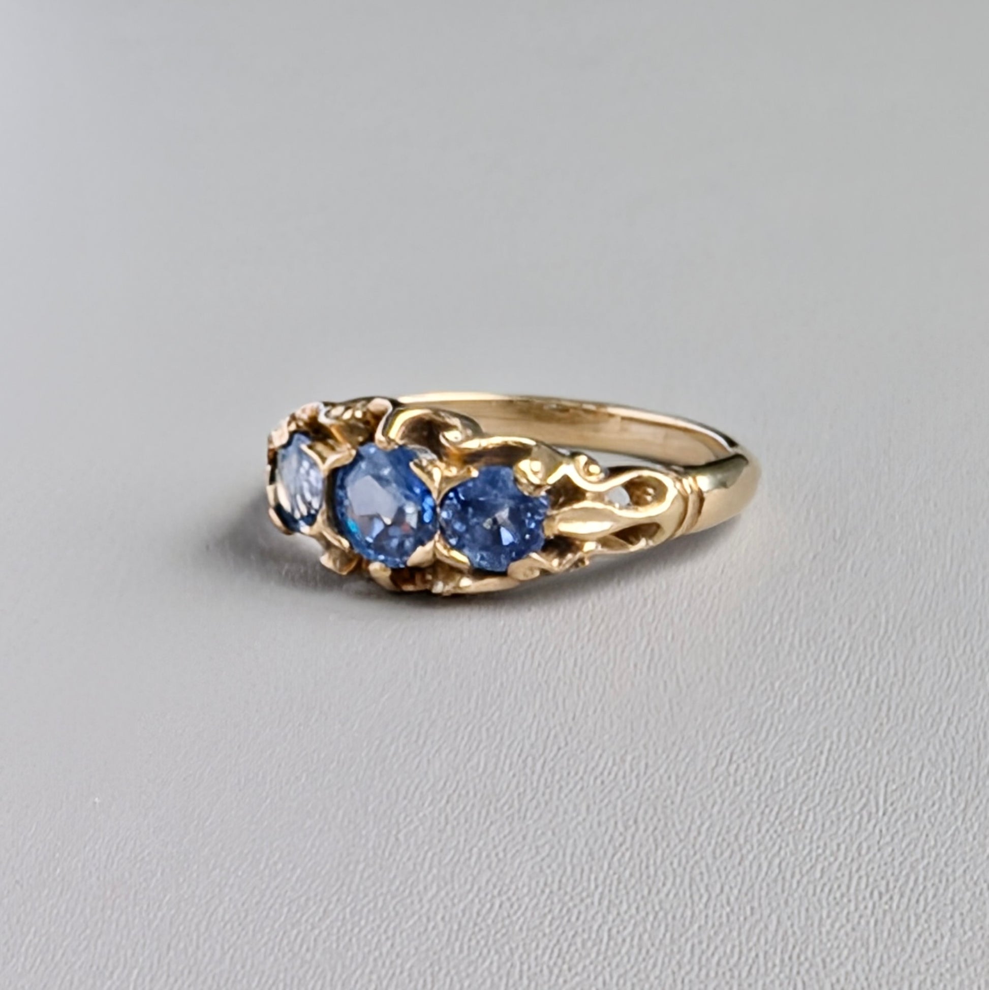 A Victorian-style half hoop ring in 9ct yellow gold, set with three round bright-blue sapphires of even colour, each claw-set within scalloped scrollwork frames that merge seamlessly into a low-worked band, creating a cohesive and elegant design inspired by 19th-century jewellery.