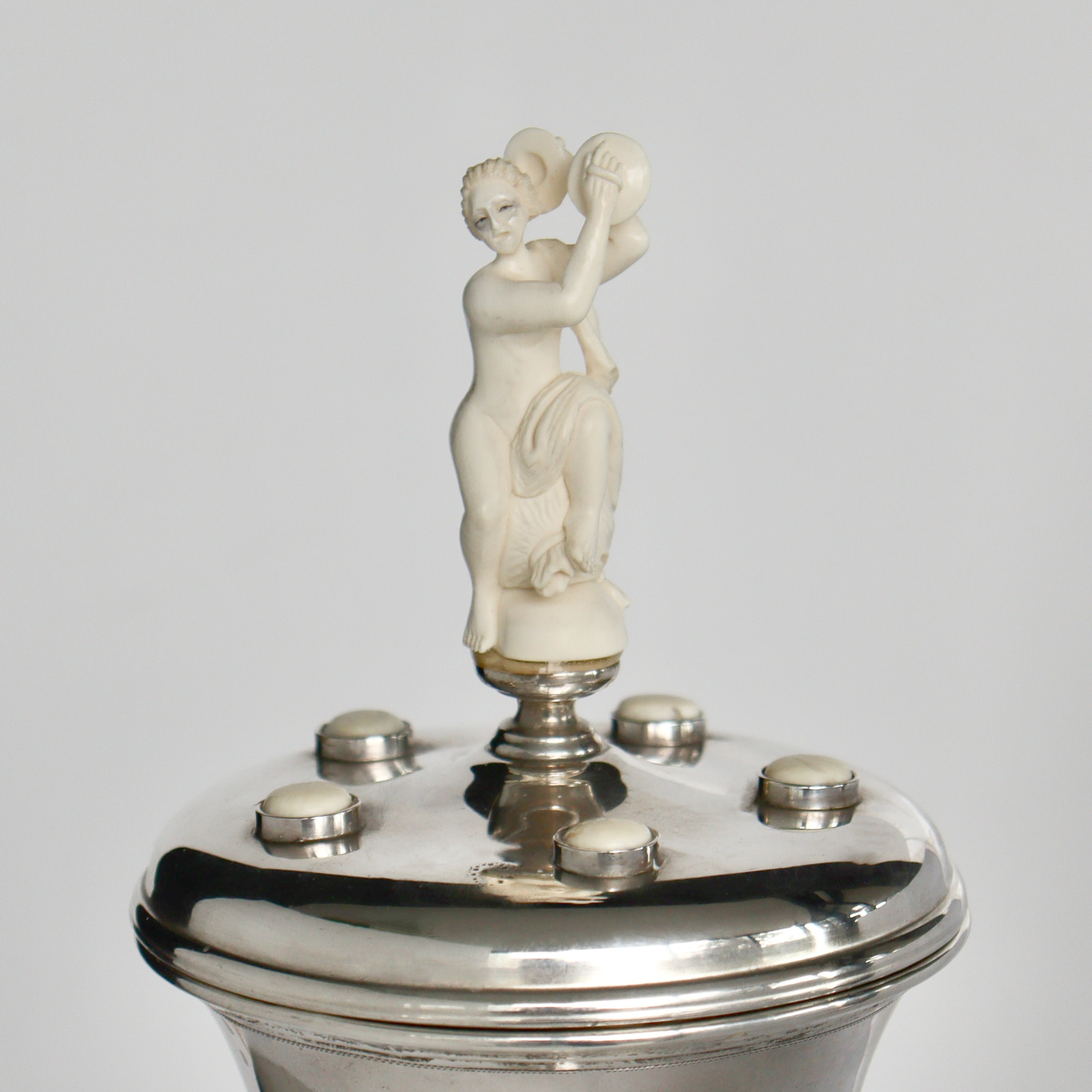 A great example of 19th Century German craftsmanship, this lidded chalice is executed in .800 silver and adorned with finely worked ivory. The domed lid is surmounted by a delicately carved ivory finial depicting a nude cymbal-dancer in dynamic pose, surrounded by five inset ivory cabochons. The chalice body features a ring of ivory with applied decorative panels of carved ivory, gracefully tapering to a turned ivory stem on an elaborate repoussé silver base, ornamented with foliage, scales and classical motifs.