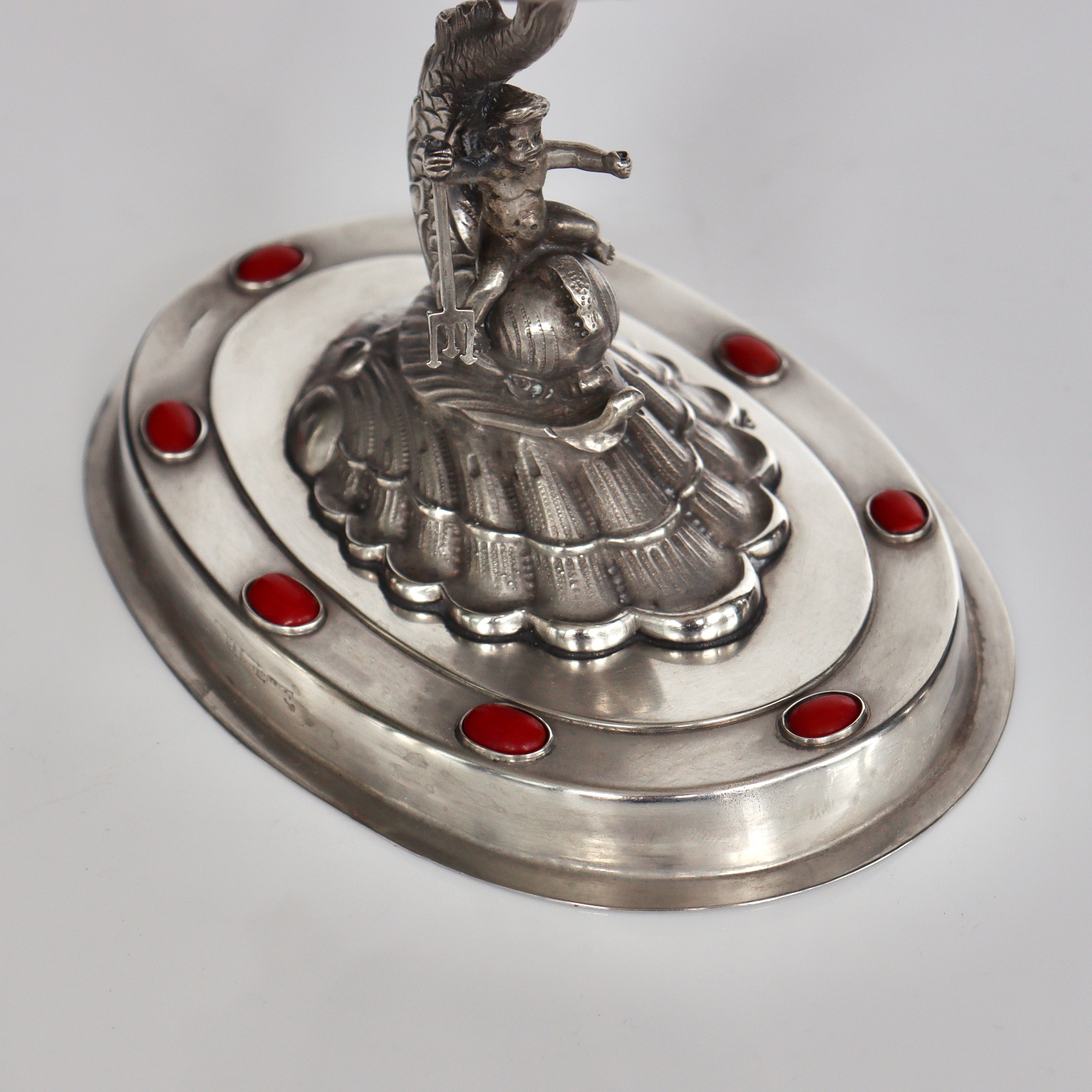 This ornate .800 silver nautilus shell cup features a finely detailed filigree silver and enamel sailing ship finial, embellished all around with inset natural coral cabochons. The cup is supported by an elaborate figural base depicting a mythological son of Poseidon astride a dolphin. The base is hallmarked with the Bamberg City mark (B) and lion rampant, along with the general crescent and crown mark.