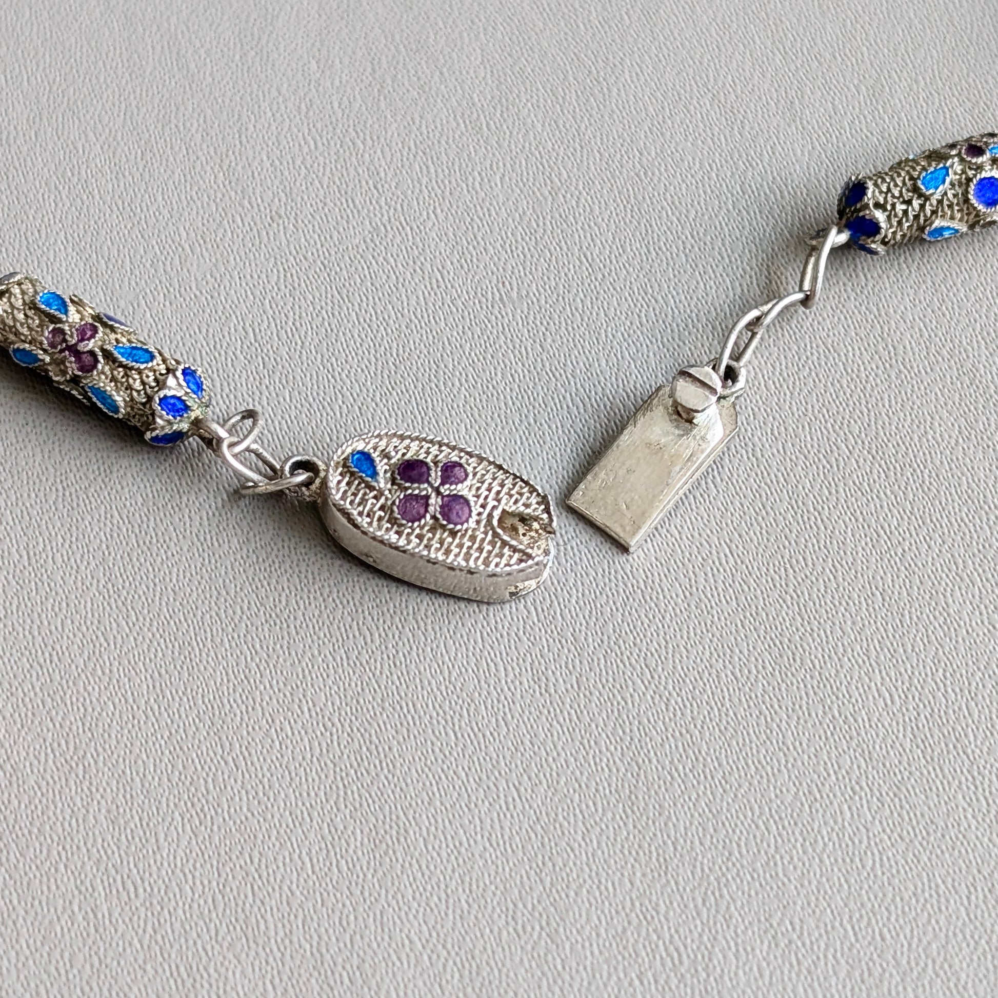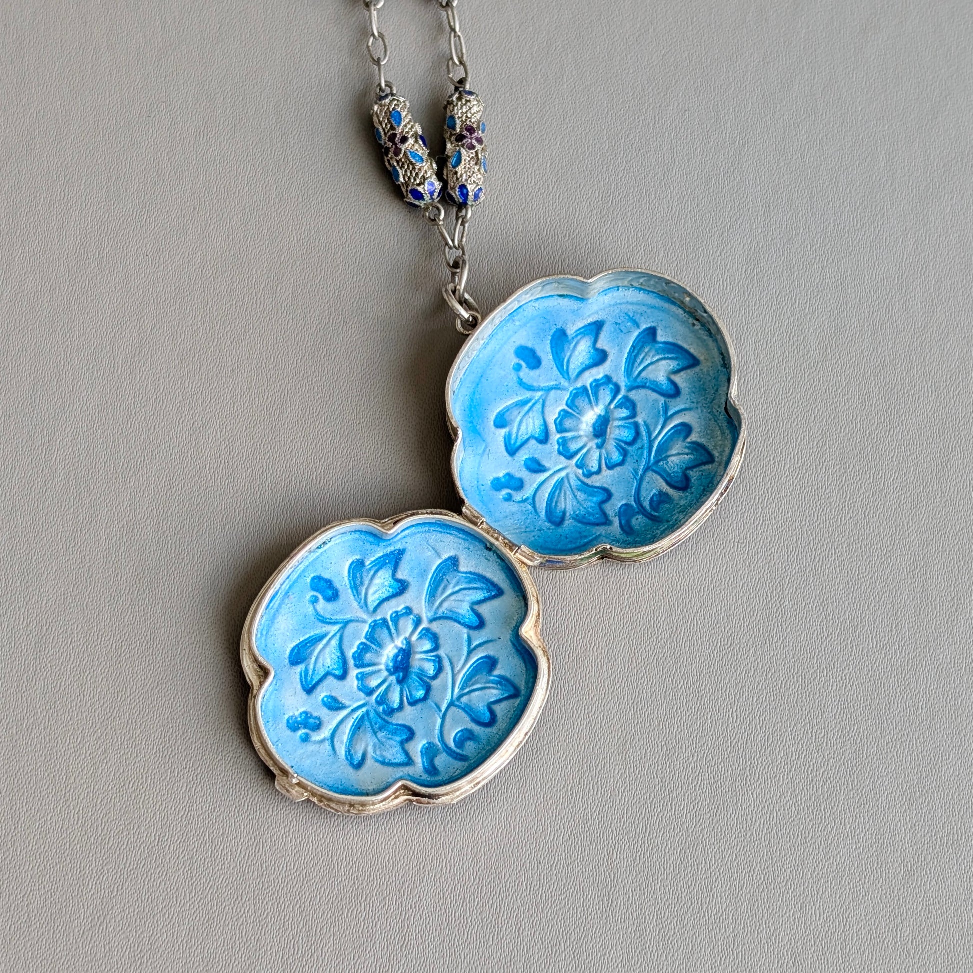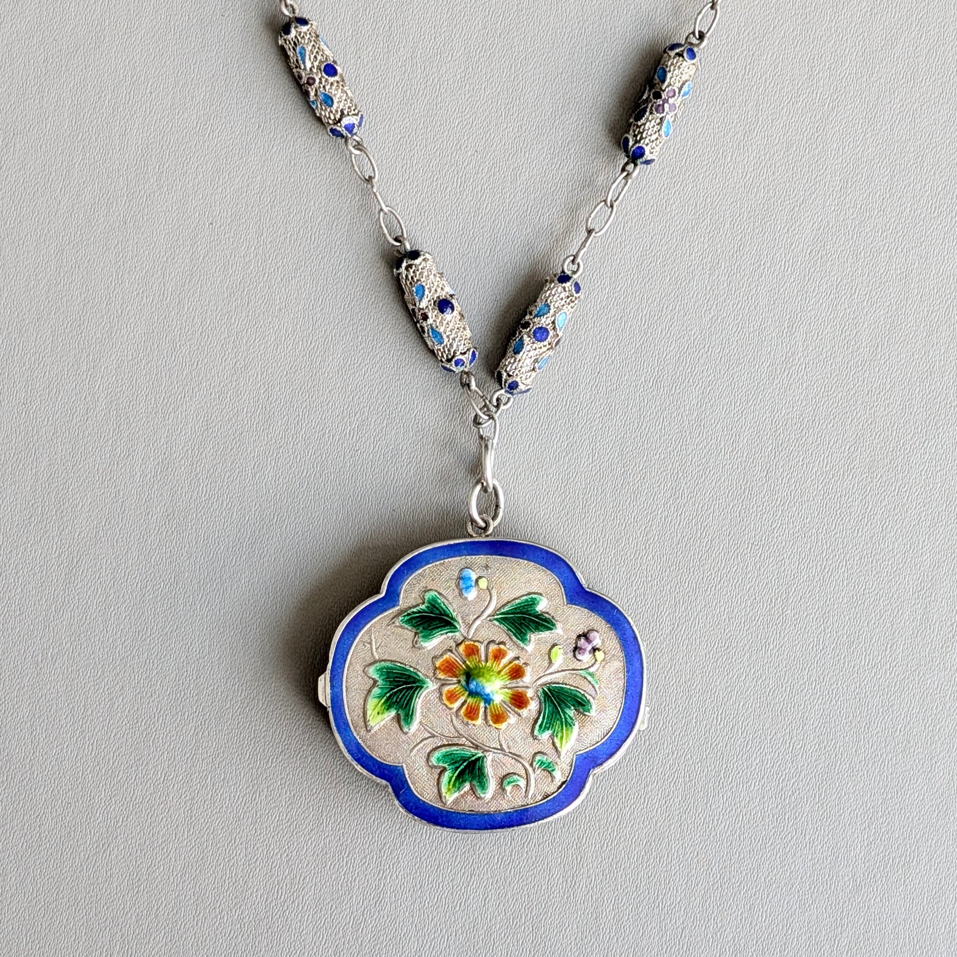 The central locket, decorated on both sides in matching cloisonné decoration, opens to reveal a compartment for a personal memento. The silver is likely of export standard, consistent with Chinese cloisonné jewellery made after the 1970s, when traditional techniques were revived for the international market.