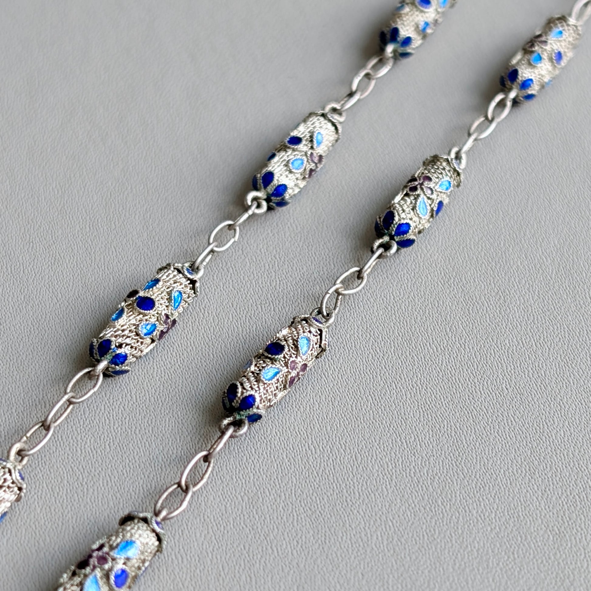 A handmade Chinese silver cloisonné locket suspended from a long articulated chain, the links formed as alternating barrel-shaped elements joined by small circular loops. The barrels are decorated in polychrome cloisonné enamels, featuring stylised flower petals against fine wirework typical of late 20th-century production.