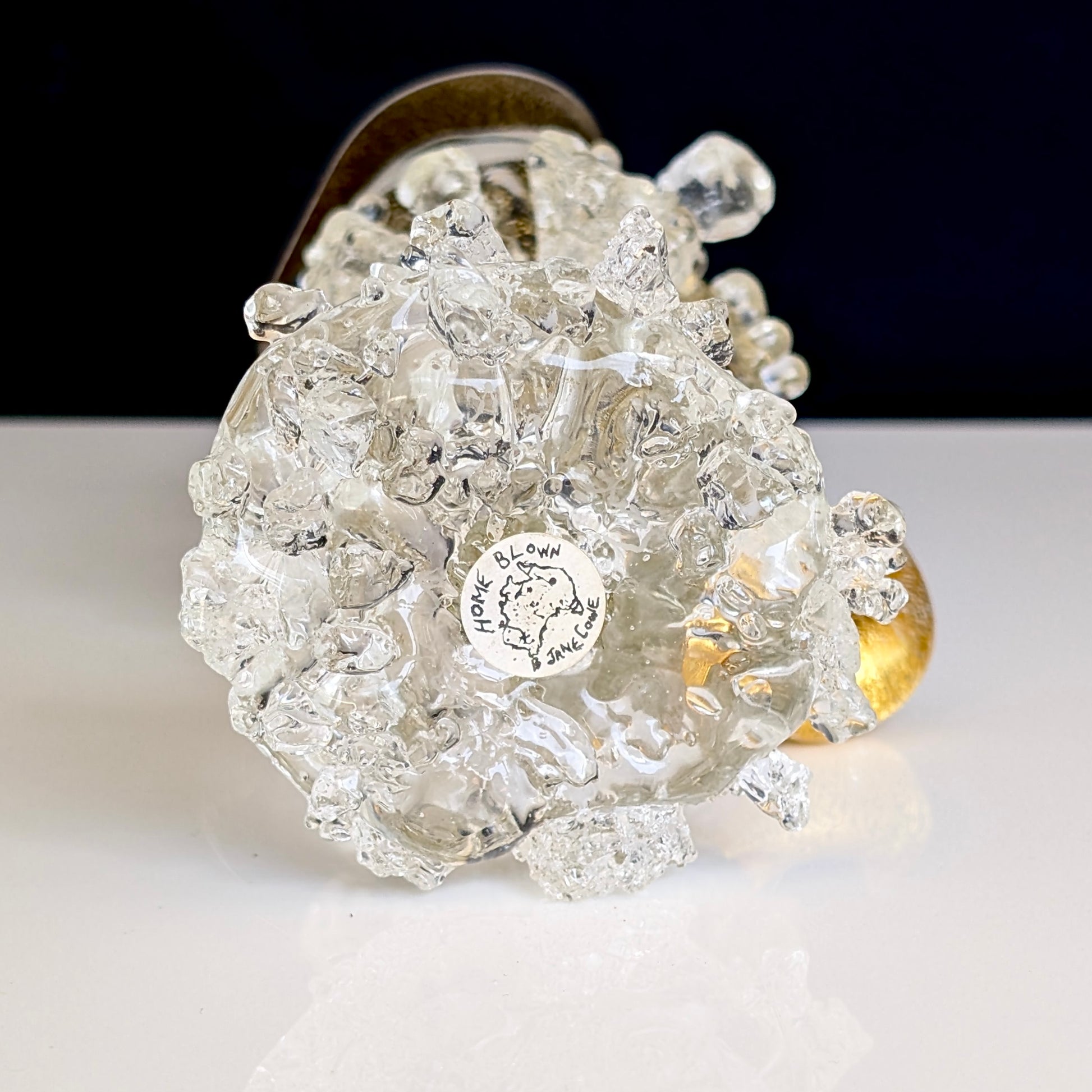 A one-off, artistically conceived, hand-blown glass sculptural vase modelled as a shipwrecked horn, encrusted with barnacles and coral, and enriched with shimmering 24k gold aventurine symbolising “golden treasures” concealed beneath the depths of the sea. The underside bears a hand-incised signature and retains the original maker’s label.