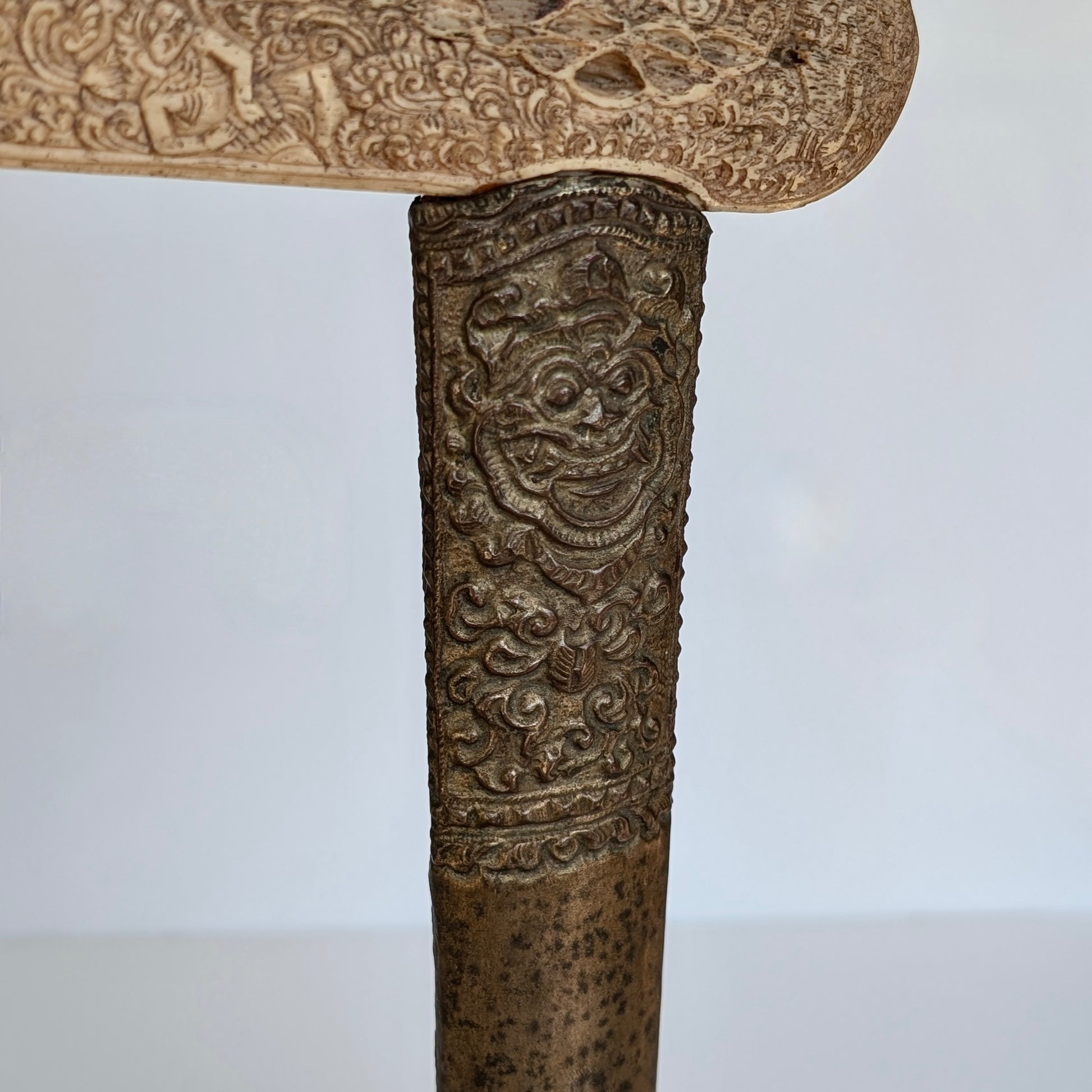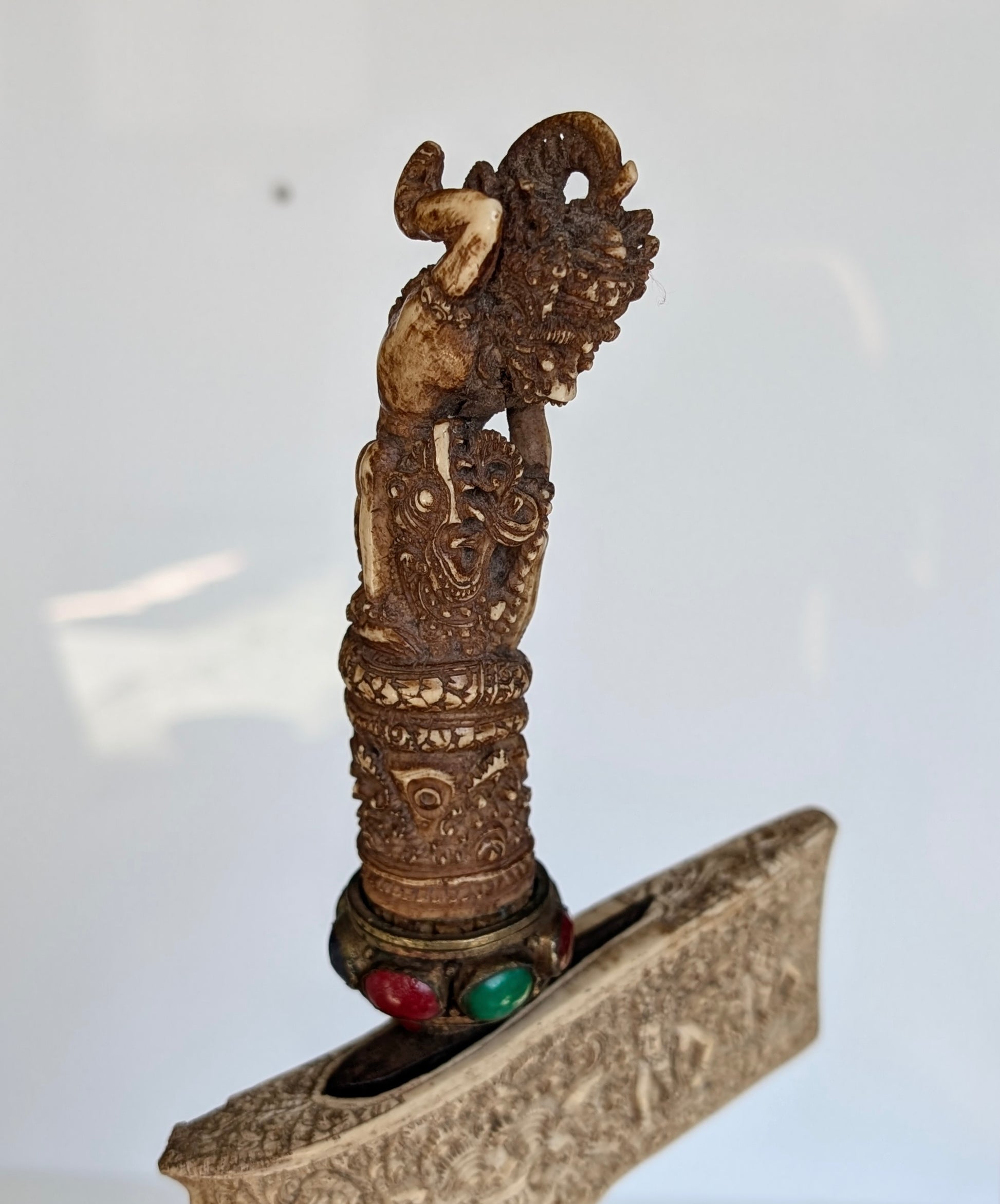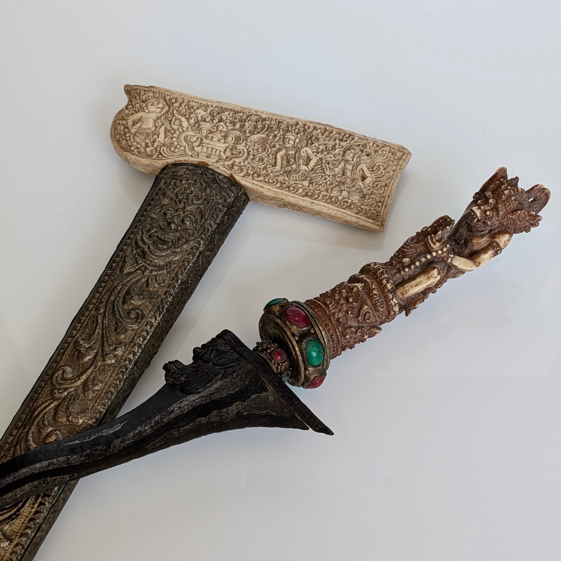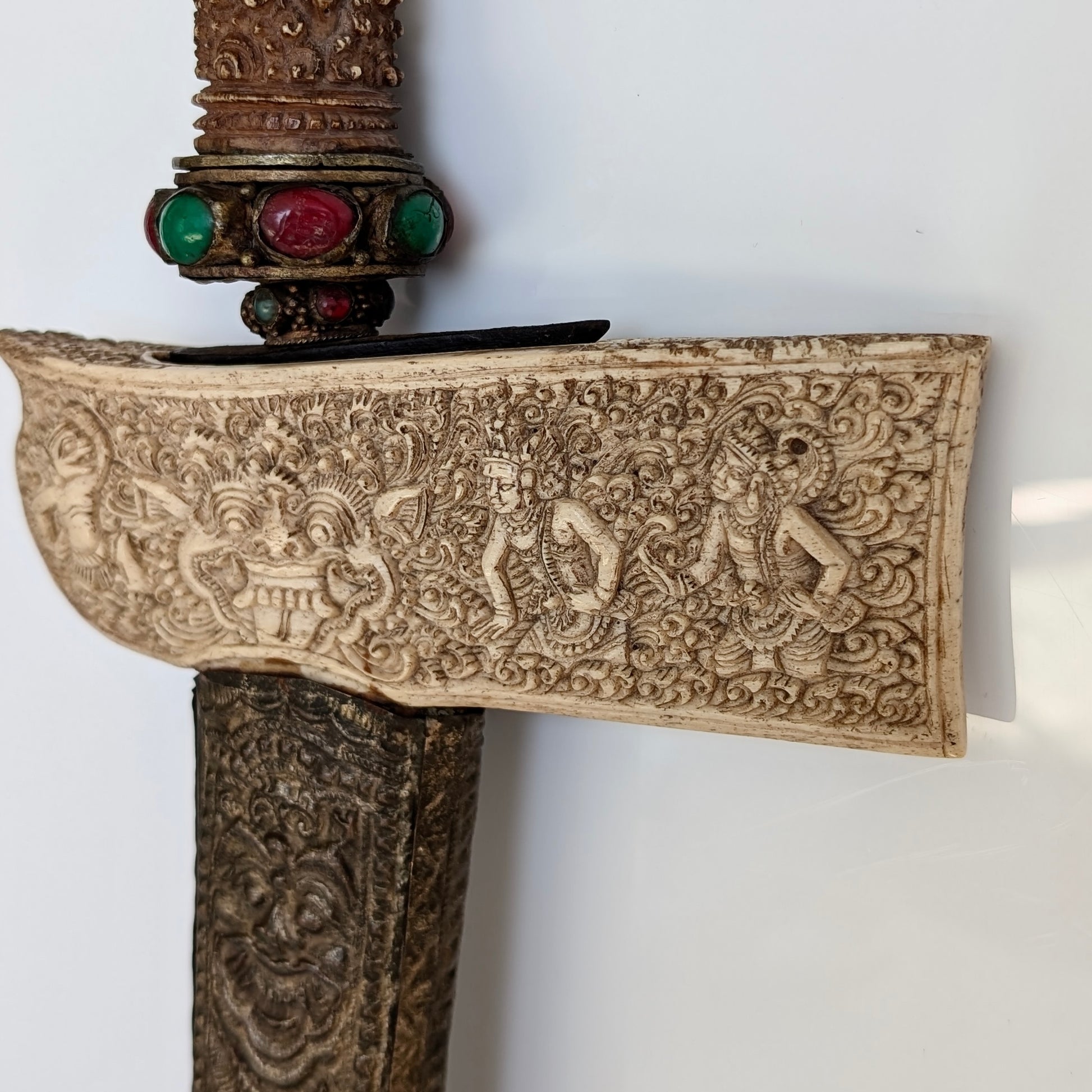 The dagger is preserved in its wood-lined scabbard, overlaid with a scroll-embossed gilt metal mount ornamented with a mask on either side. Dominating the ensemble is a large carved ivory sarongan, worked in deep relief on both sides with detailed scenes drawn from Balinese Hindu mythology. One side is centred by a protective monster mask, serving as a talismanic guardian, while the surrounding narrative panels display accomplished carving of figures and sacred motifs.