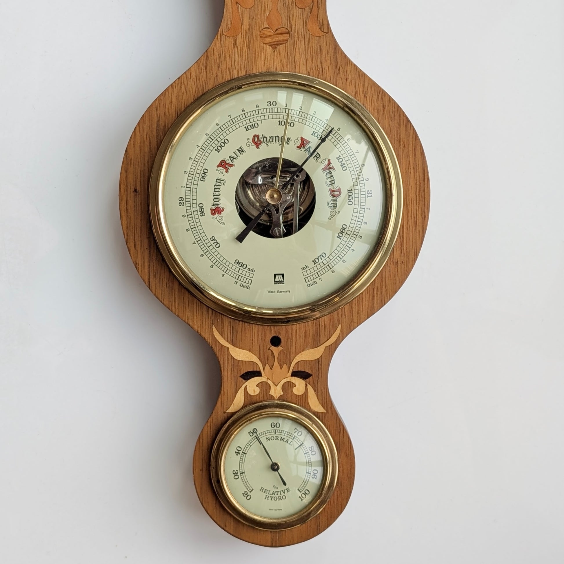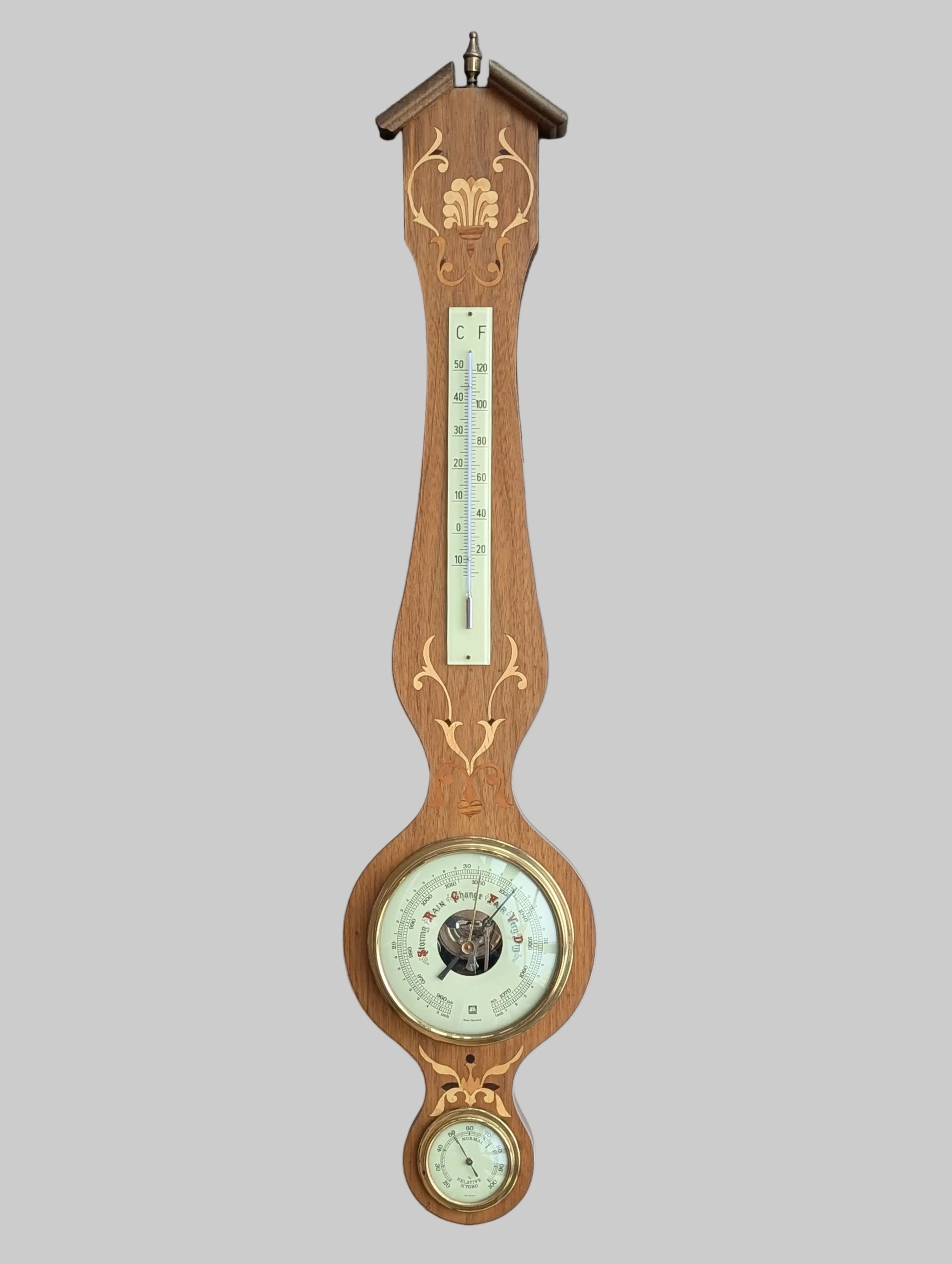A mid-20th century oak weather station, elegantly appointed with a suite of instruments comprising a barometer with large central dial, a thermometer with vertical scale above, and a hygrometer with subsidiary dial below, each housed within polished brass bezels and protected by glass. The oak case is finely inlaid with decorative fruitwood and surmounted by a brass finial. The instruments signed HUGER, West Germany, the wooden case likely of Italian or Swiss manufacture.