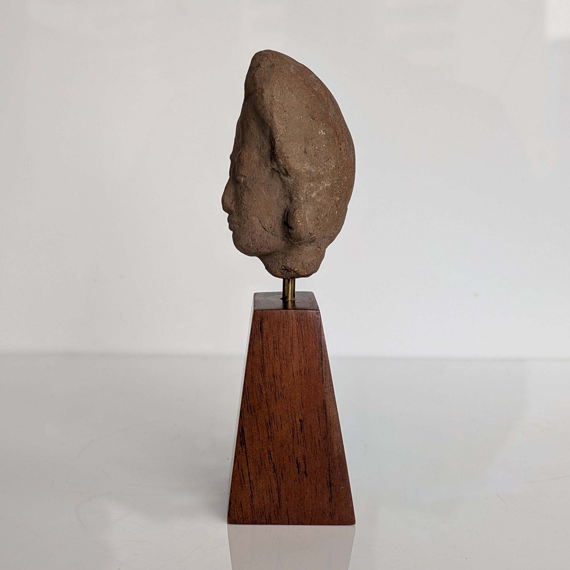 A large terracotta head of a woman, finely modelled with softly articulated features, her hair drawn and gathered to the left side of the head. Traces of earrings remain visible, originally more pronounced and likely formed as floral ornaments. A good example of Majapahit terracotta sculpture, dating to the 14th–15th century. Mounted on a custom walnut museum stand for display (removable).