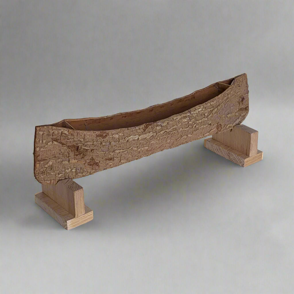 Saugeen First Nation is an Ojibwe First Nation band located along the Saugeen River and Bruce Peninsula in Ontario, Canada, with a population of approximately 2,000. Presented here is a hand-crafted birchbark canoe model, dating to the late 1960s, attributed to an Ojibwe maker and faithfully replicating an early traditional canoe design. Presented on two later pine display stands.