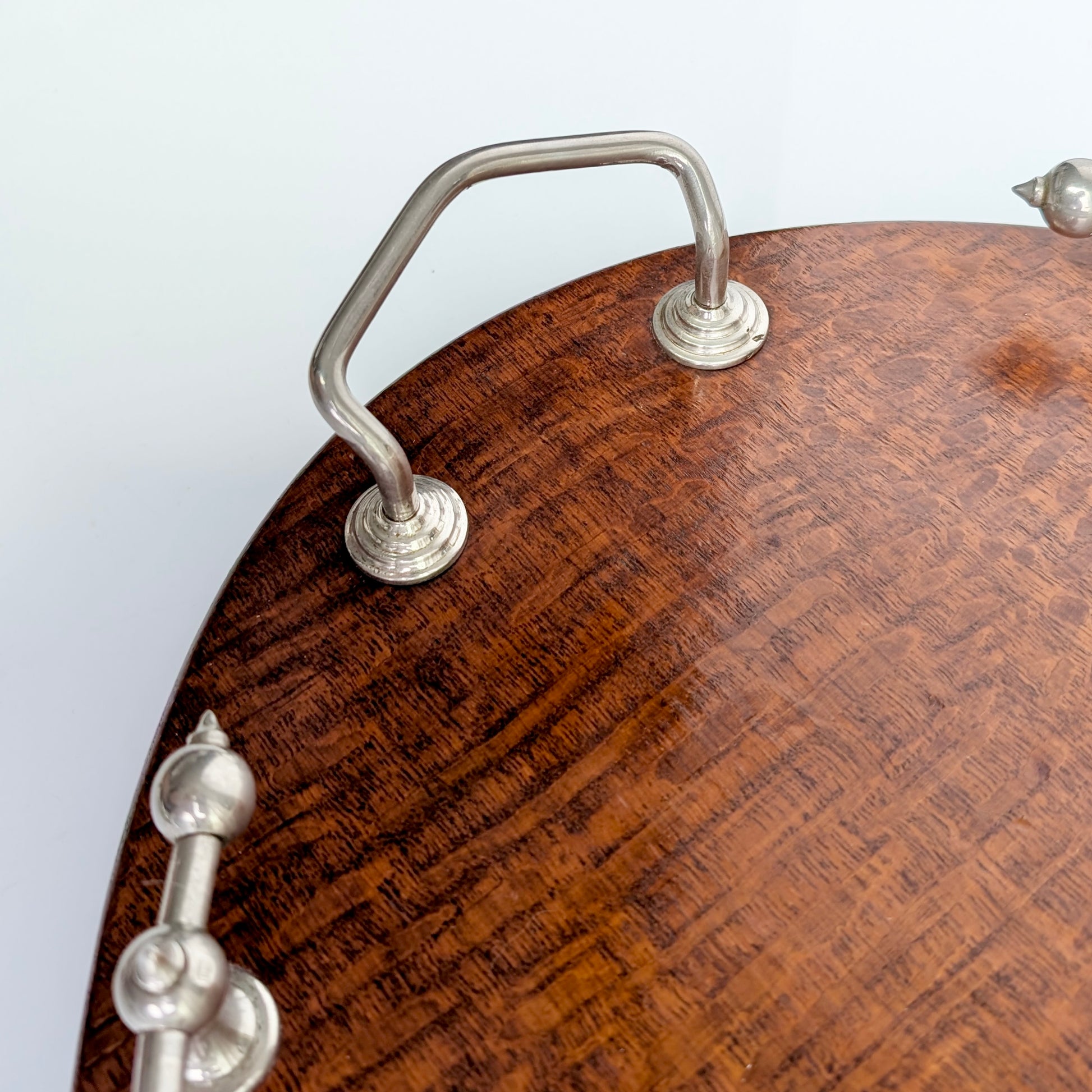 A large and impressive English oval serving tray dating to c1905. Crafted from oak, the warm-toned surface enclosed by a silver-plated gallery, and fitted with twin side handles for ease of service and presentation.