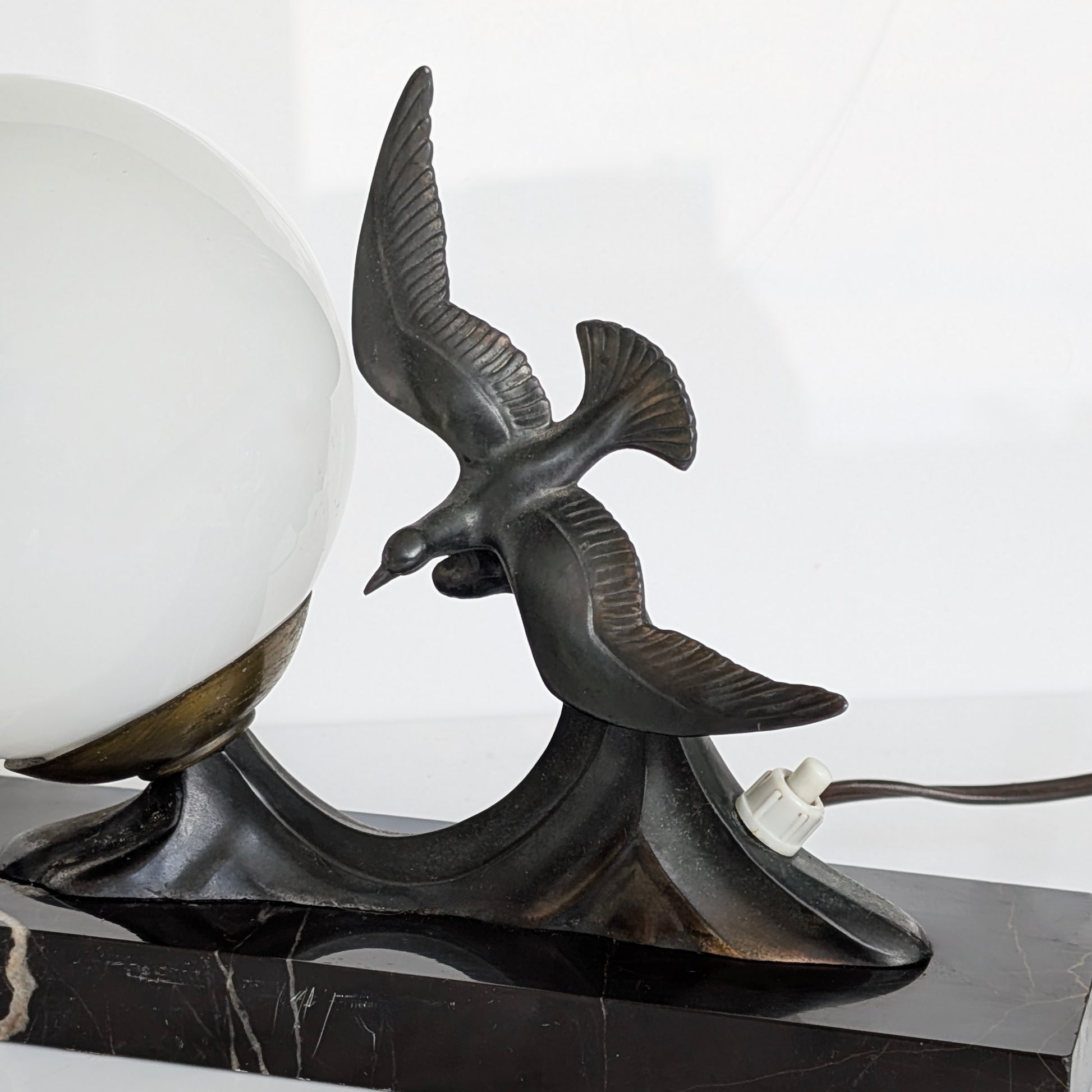 A c1930 Art Deco lamp featuring a seagull in full flight above waves in copper bronze and pewter colours beside a globular milk glass shade, raised upon a veined black marble base. Boasts its original French plug and will require rewiring for modern use in Australia.