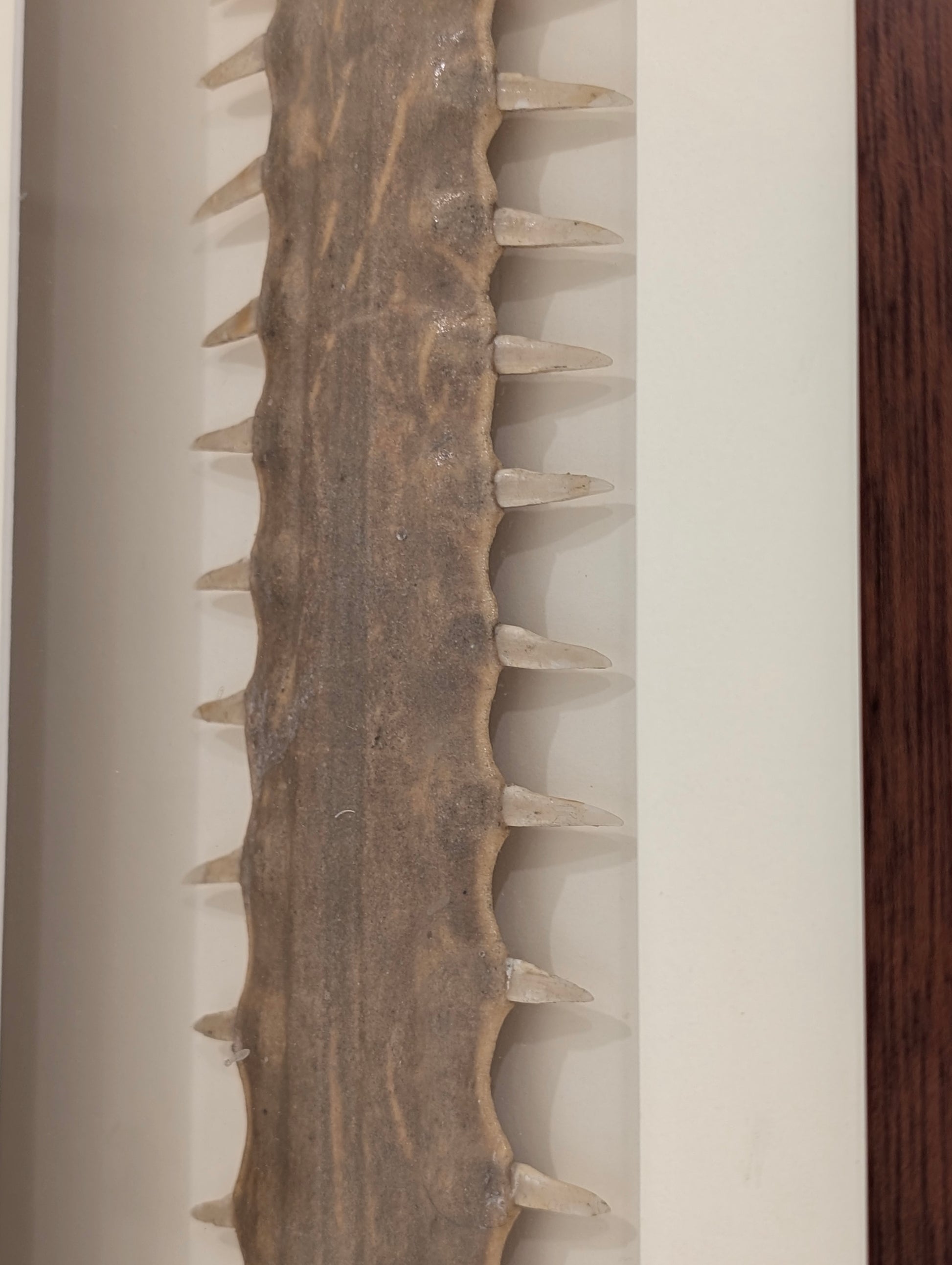 A rarely found Queensland sawfish (pristis clavata) rostrum, expertly mounted within a museum-quality walnut shadow box and protected behind glass. An outstanding and well-preserved example, retaining all original teeth with the exception of one.