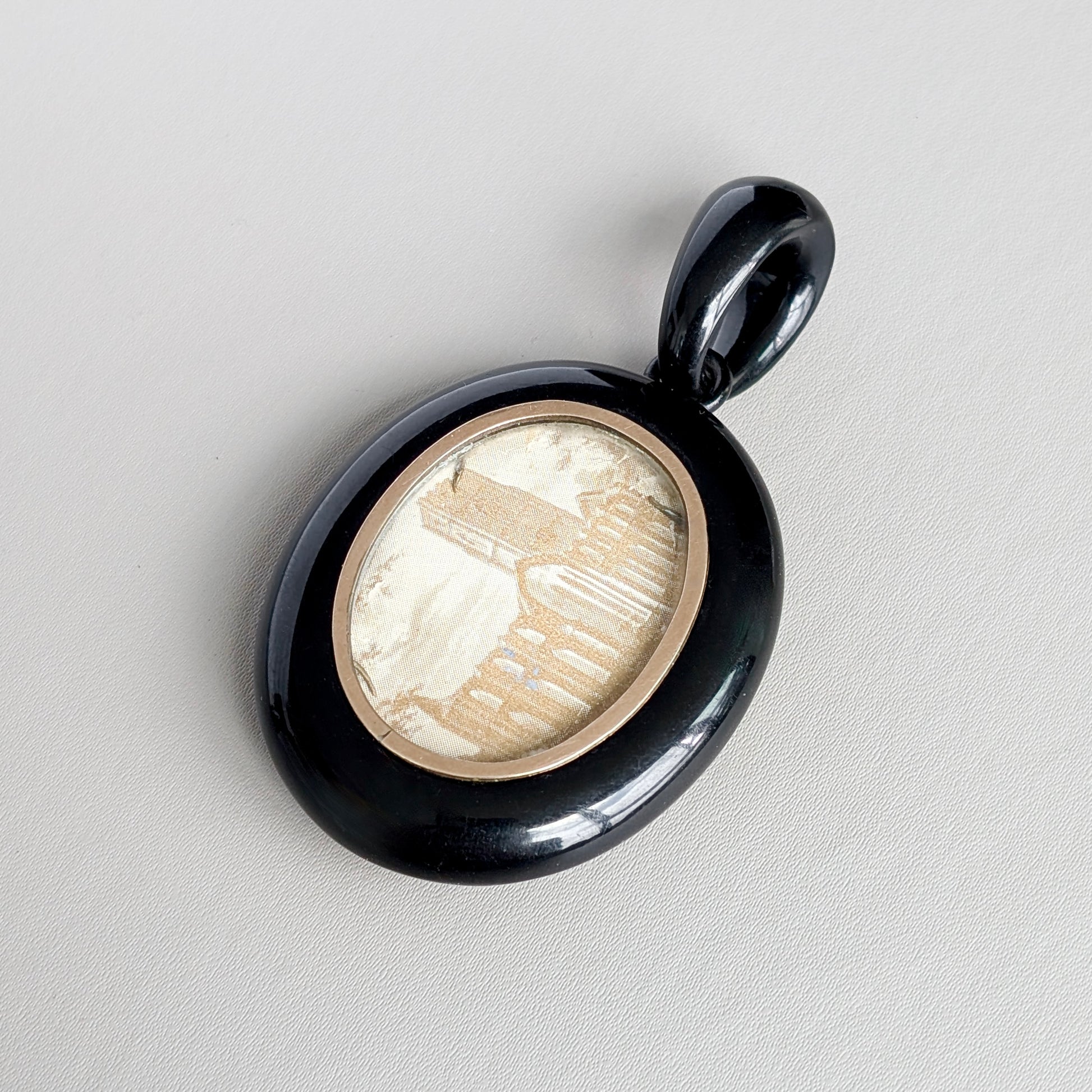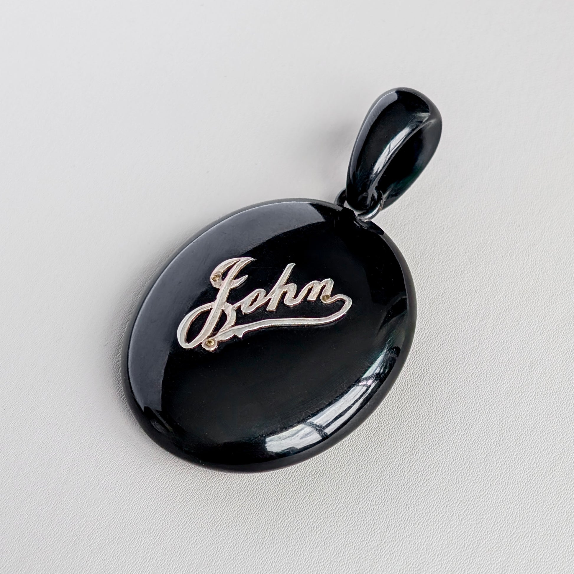 An impressive and substantial Victorian Whitby jet mourning locket of polished oval form, dating to circa 1880. The locket is mounted with a removable 9ct gold bezel, allowing the interior to hold a photograph or a compartment of woven hair beneath the glass, as was customary for mourning jewellery of the period. The reverse is applied with the name "John" in sterling silver, accented with gold studs, adding a highly personal and poignant detail. Currently it hosts an architectural photo as a placeholder example.