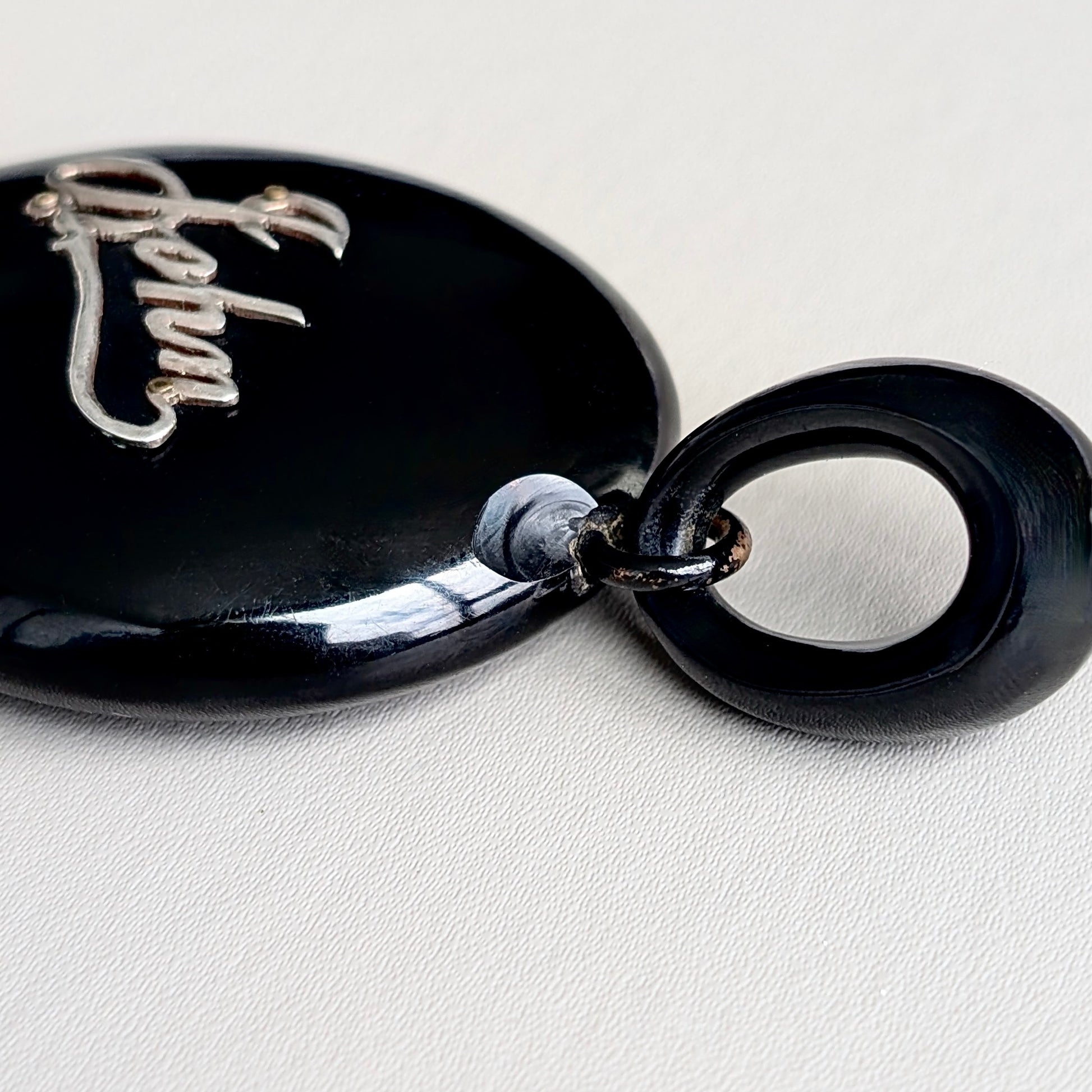 Condition: Overall very good for its age, with one small chip visible to the very top beneath the bail, not detracting from the overall appearance. Minor surface scuffs commensurate with age. A fine and evocative example of late Victorian mourning jewellery, notable for its scale, quality of jet, and personal inscription.