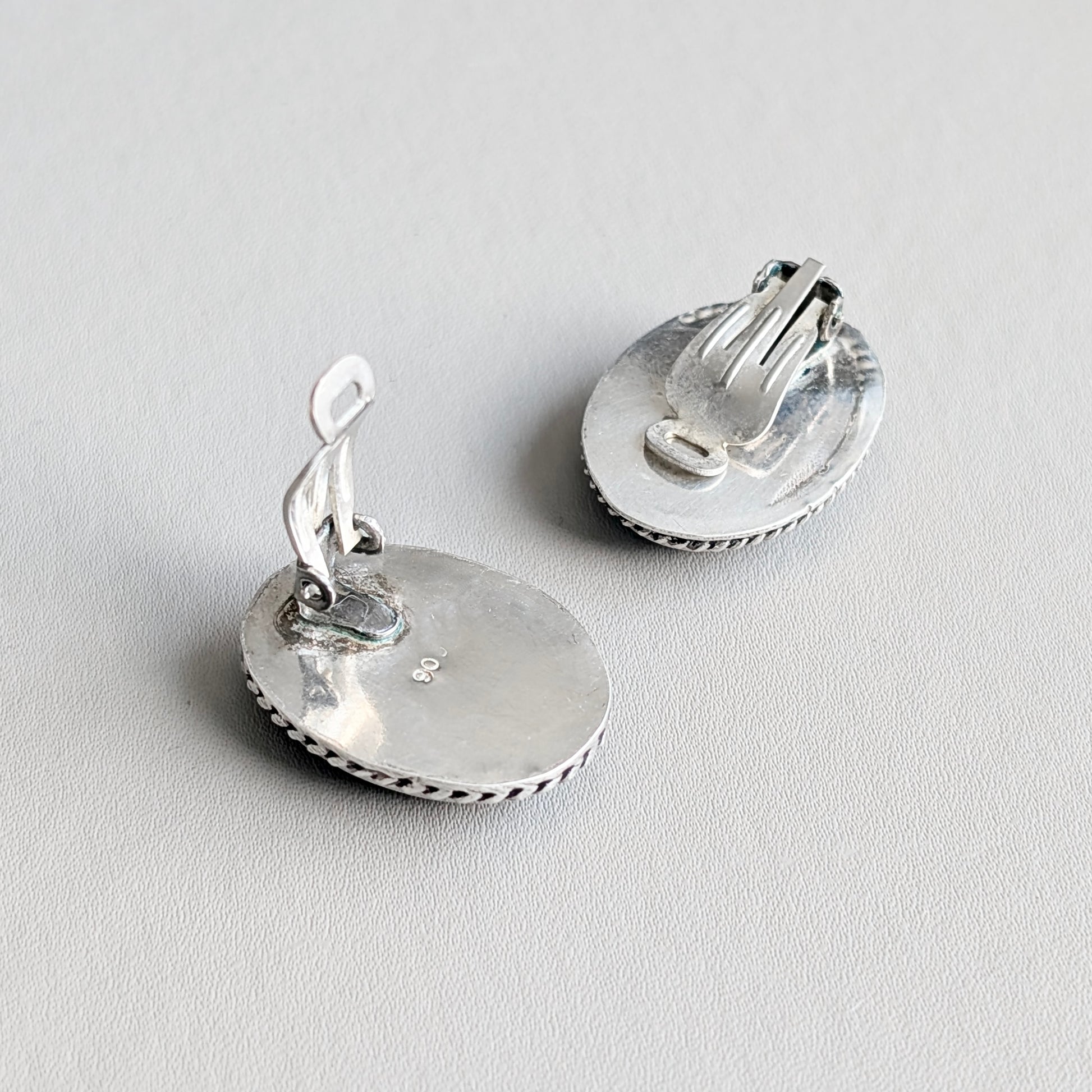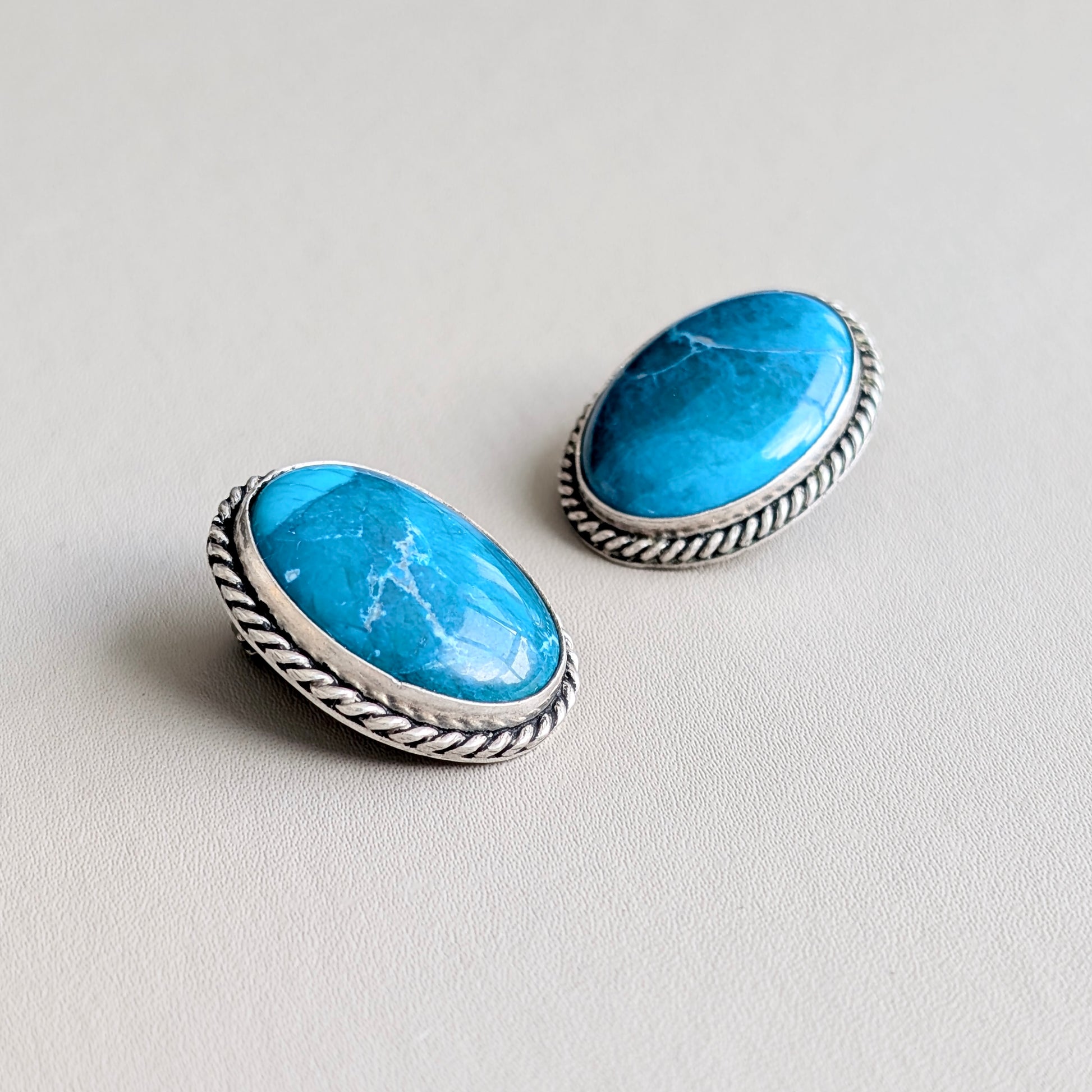 A pair of vintage clip-on earrings crafted in .900 silver, each set with an oval cabochon of dyed howlite designed to emulate the appearance of turquoise. The stones display a pleasing blue tone with naturalistic matrix veining, framed by a raised rope-twist band forming a decorative border around the edge. Finished with secure clip-on fittings, these earrings offer a bold yet classic look suitable for many outfits.