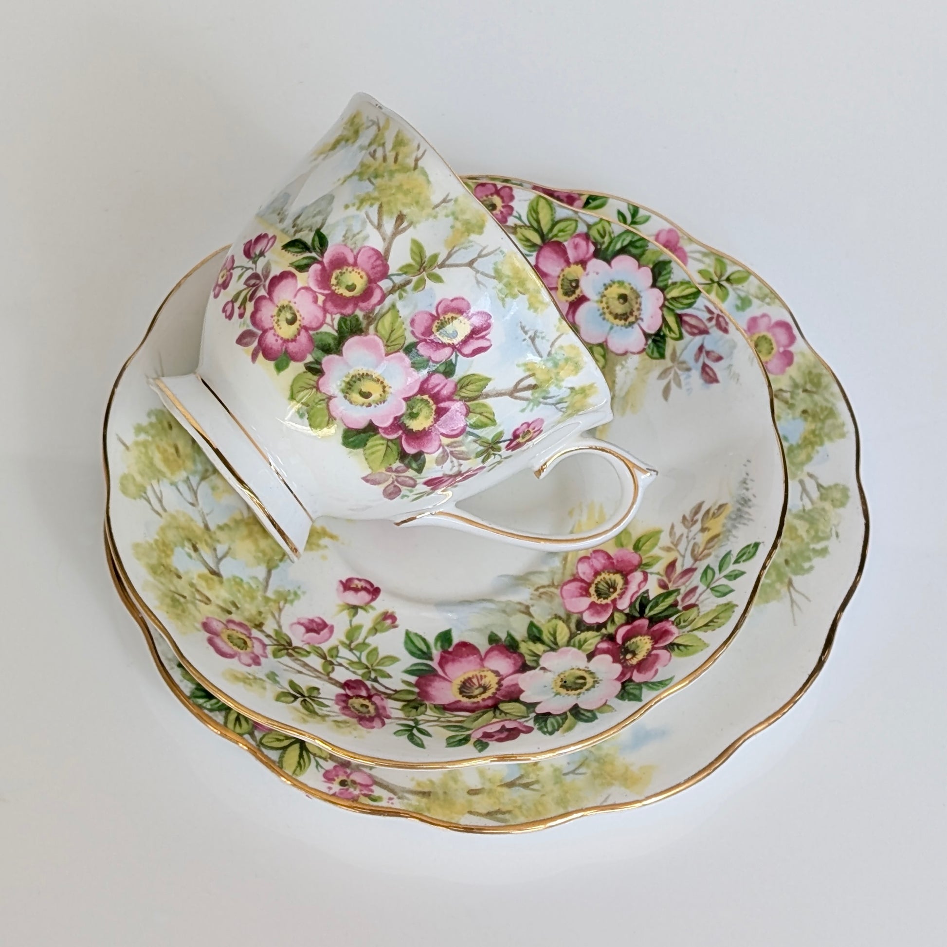 An early Royal Albert "Wild Rose" bone china teacup trio.